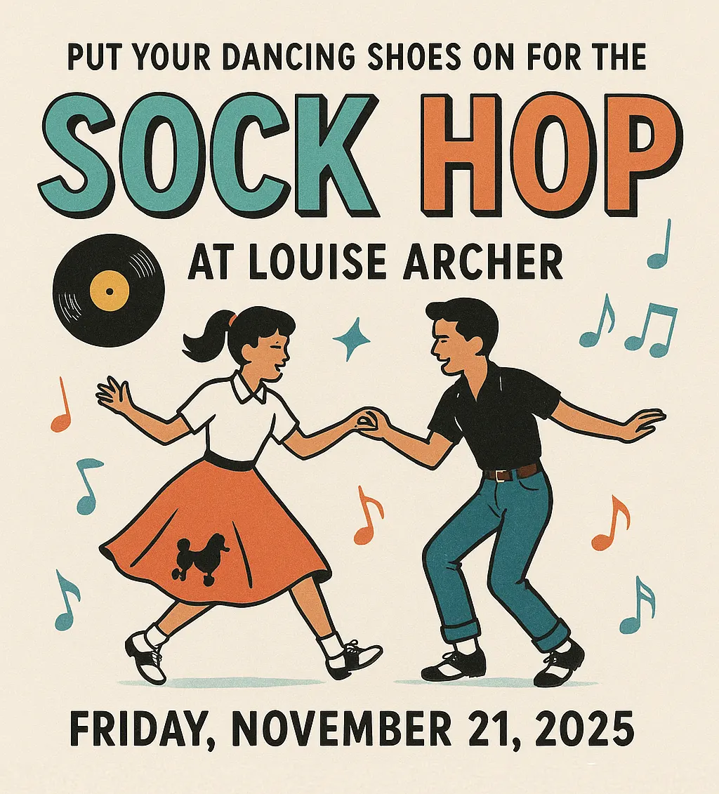 Put your dancing shoes on for the Sock Hop at Louise Archer. We will have food in the Cafeteria and a DJ in the Gym. Our 6th graders will hop the tables and raise funds via tips for their 6th grade celebration. There is no charge for entry to the Sock Hop, but tickets for food and drinks will be available. All students and parents are welcomed to join the party for free!